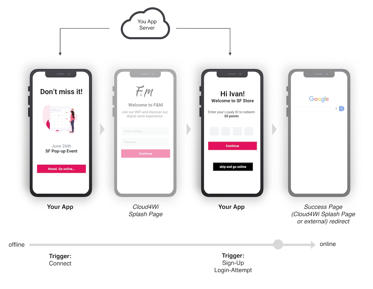 The Access Journey tool, available in the Cloud4Wi Dashboard, allows you to publish your App in different steps of the onboarding experience, before or after the main Splash Page home, forcing the user to go through a series of pages before getting online: