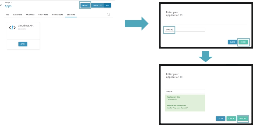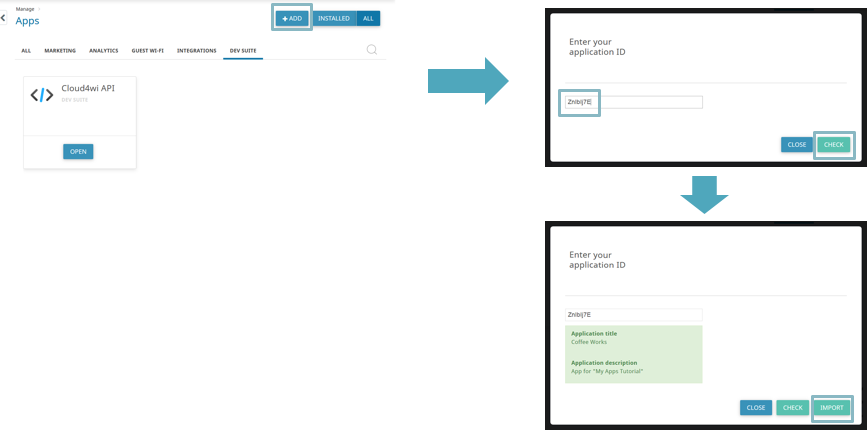 Login in your Cloud4Wi Dashboard. Through the Apps page, you can install the application by clicking on the Add button, entering the “App Id” displayed after clicking “Publish” on the MyApps Portal, and then clicking on Import.