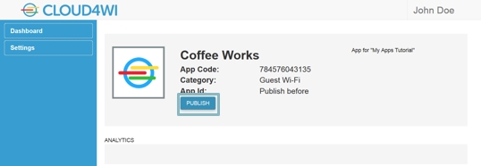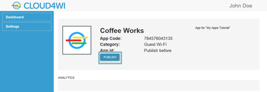 In order to use it, you need to install it on your Cloud4Wi Account. As a first step, you need to click the button “Publish” in the app dashboard page.