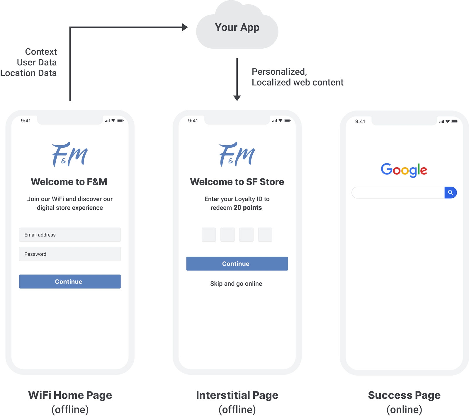 When a customer connects to WiFi, at the right time, Cloud4Wi redirects the user to your web application including, all the context info that you might need to create a personal experience. The MyApps, also allows you to adapt your application to let the user go online once he has consumed your content.